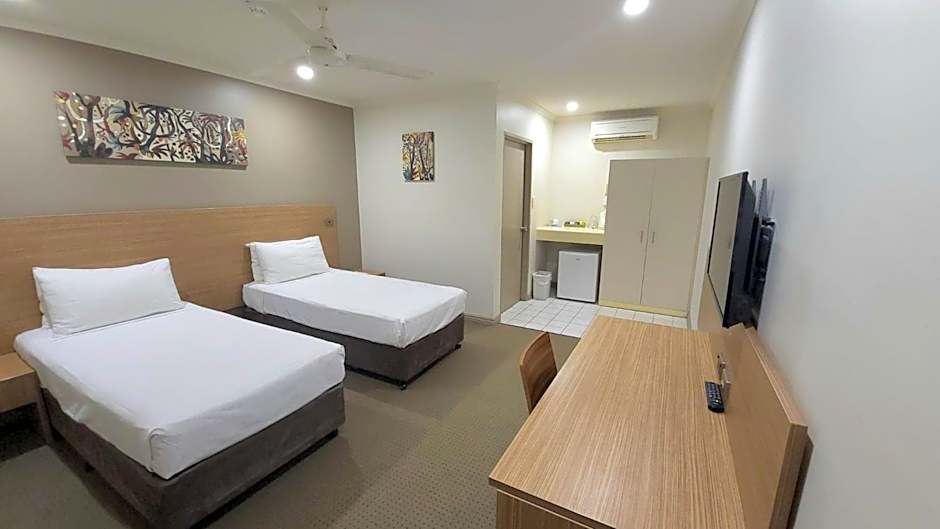 Studio Quad Room (Kitchenette) is 388 square feet and includes either a king-size bed 150-183 width or 2 single beds 80-130 width plus extra beds on demand, desk, and hairdryer.